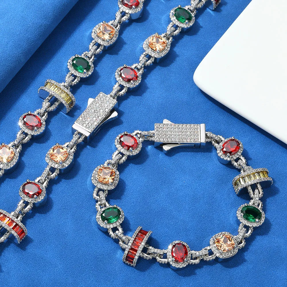 Magas minőségű rézötvözetből készül, elegáns arany vagy ezüst bevonattal. Unisex kialakítása merész geometrikus formát ötvöz a szivárvány színeiben pompázó prémium cirkónia kövekkel. Egy valódi statement darab, amely bármilyen öltözéket kiemel.