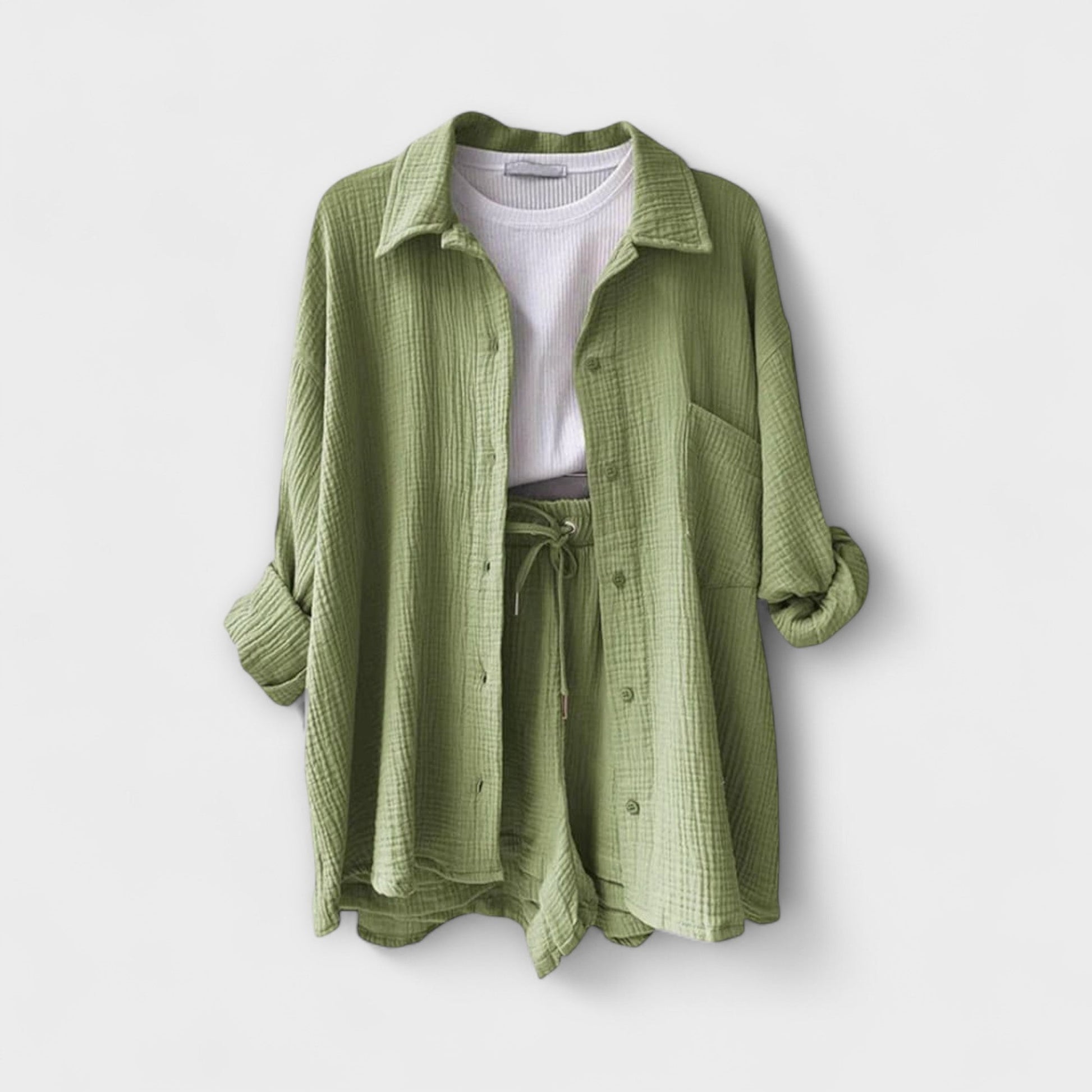 A Victoria kényelmes két részes szett a tökéletes kombinációja a kényelemnek és a stílusnak a gardróbod számára. Meleg időjárásra tervezve, légáteresztő anyagokból készült, amelyek egész nap friss és kényelmes viseletet biztosítanak.